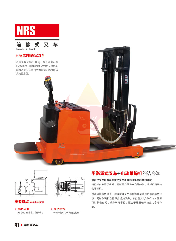 NRS系列前移式叉車是工業(yè)搬運(yùn)車輛,倉儲(chǔ)叉車的一種,是指對(duì)成件托盤貨物進(jìn)行裝卸、堆垛和短距離運(yùn)輸作業(yè)的前移輪式搬運(yùn)車輛。用于倉儲(chǔ)大型物件的運(yùn)輸,電池驅(qū)動(dòng),液壓工作站提升。