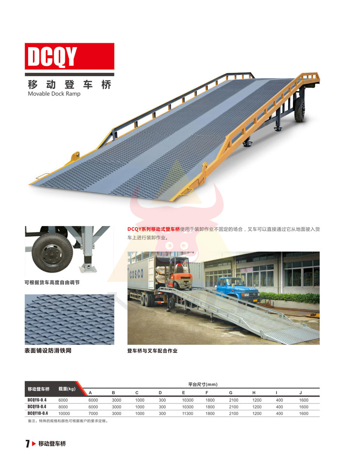 DCQY系列移動式登車橋適用于裝卸作業(yè)不固定的場合,叉車可以直接通過它從地面駛?cè)胴涇嚿线M(jìn)行裝卸作業(yè),該產(chǎn)品具有高強(qiáng)度的焊接鋼構(gòu),表面鋪設(shè)防滑鐵網(wǎng),使裝卸作業(yè)更安全、更快捷、更高效。