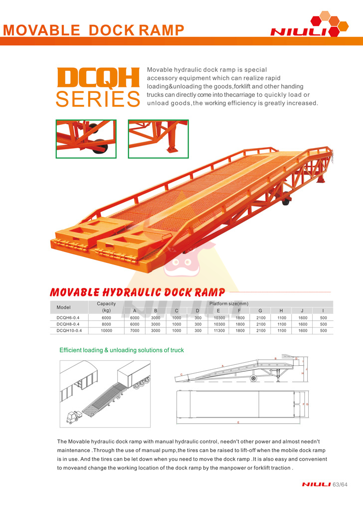 Movable dock ramp is special accessory equipment which can realize rapid loading&unloading the goods, forklift and other handing trucks can directly come into the carriage to quickly load or unload goods,the working efficiency is greatly increased.