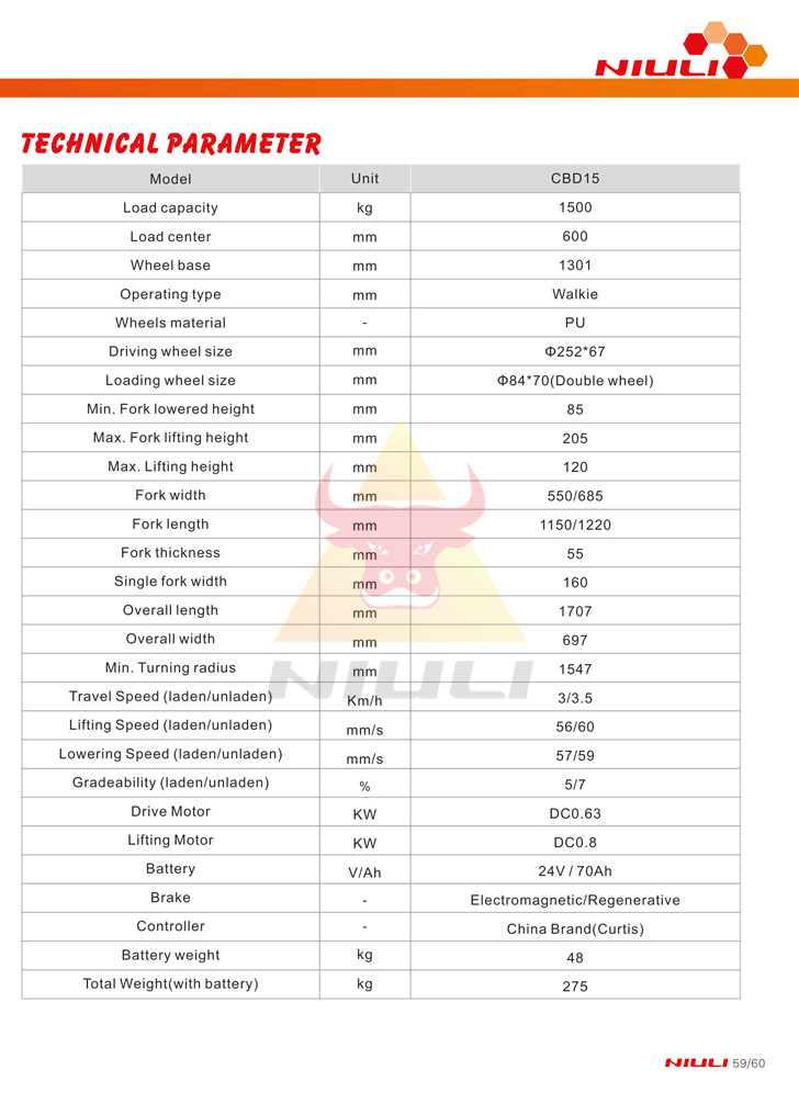 Model | Load capacity(kg) | Max.Lifting height(mm) | Fork length(mm) | Min.Lifting height(mm) | Truck weight(kg) |